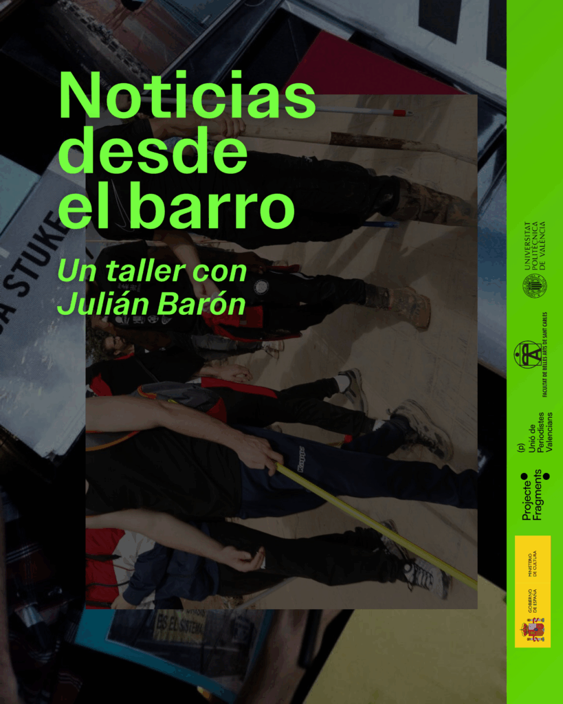 El taller, a cargo de Julián Barón, abordará de forma colaborativa las consecuencias de la DANA de 2024 en diversos municipios del territorio valenciano. A lo largo de nueve sesiones de trabajo, de un total de 40 horas de duración y de carácter gratuito, se propondrá un espacio de creación en el que los archivos personales de los participantes se activen para generar un relato colectivo en torno a la memoria, la ecología y el poder. El proceso incluirá sesiones de edición, construcción narrativa, diseño y maquetación.